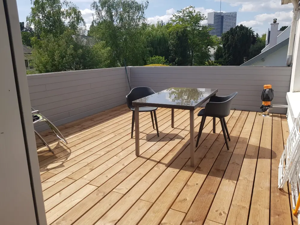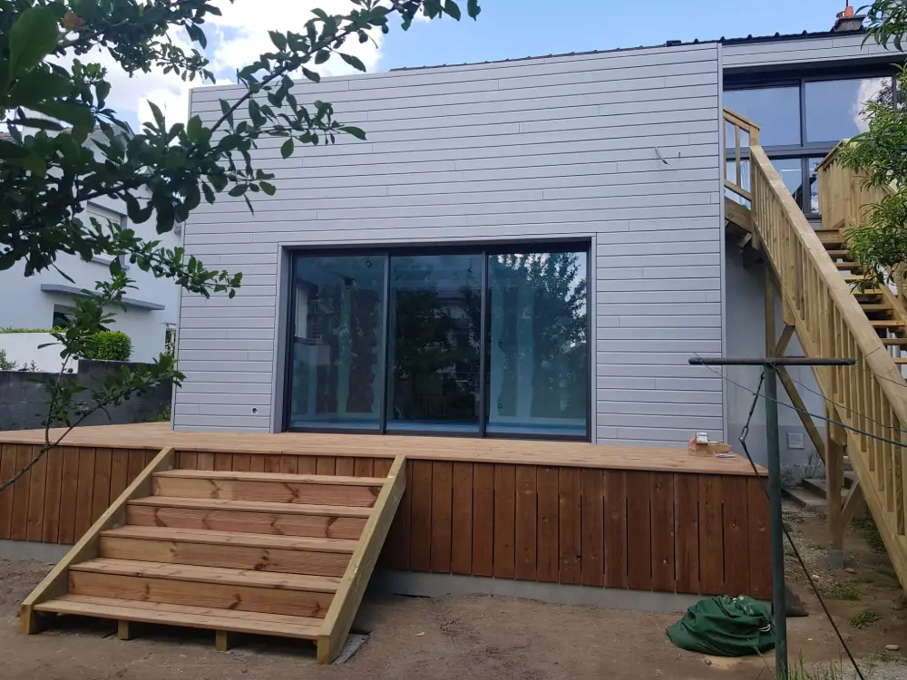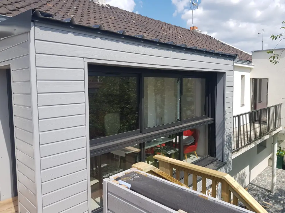 La maison a gagné en lumière avec ses grandes baies vitrées, la terrasse située sur le toit crée un espace intimiste et la cliente peut profiter d’une vue plongeante sur son jardin très arboré.