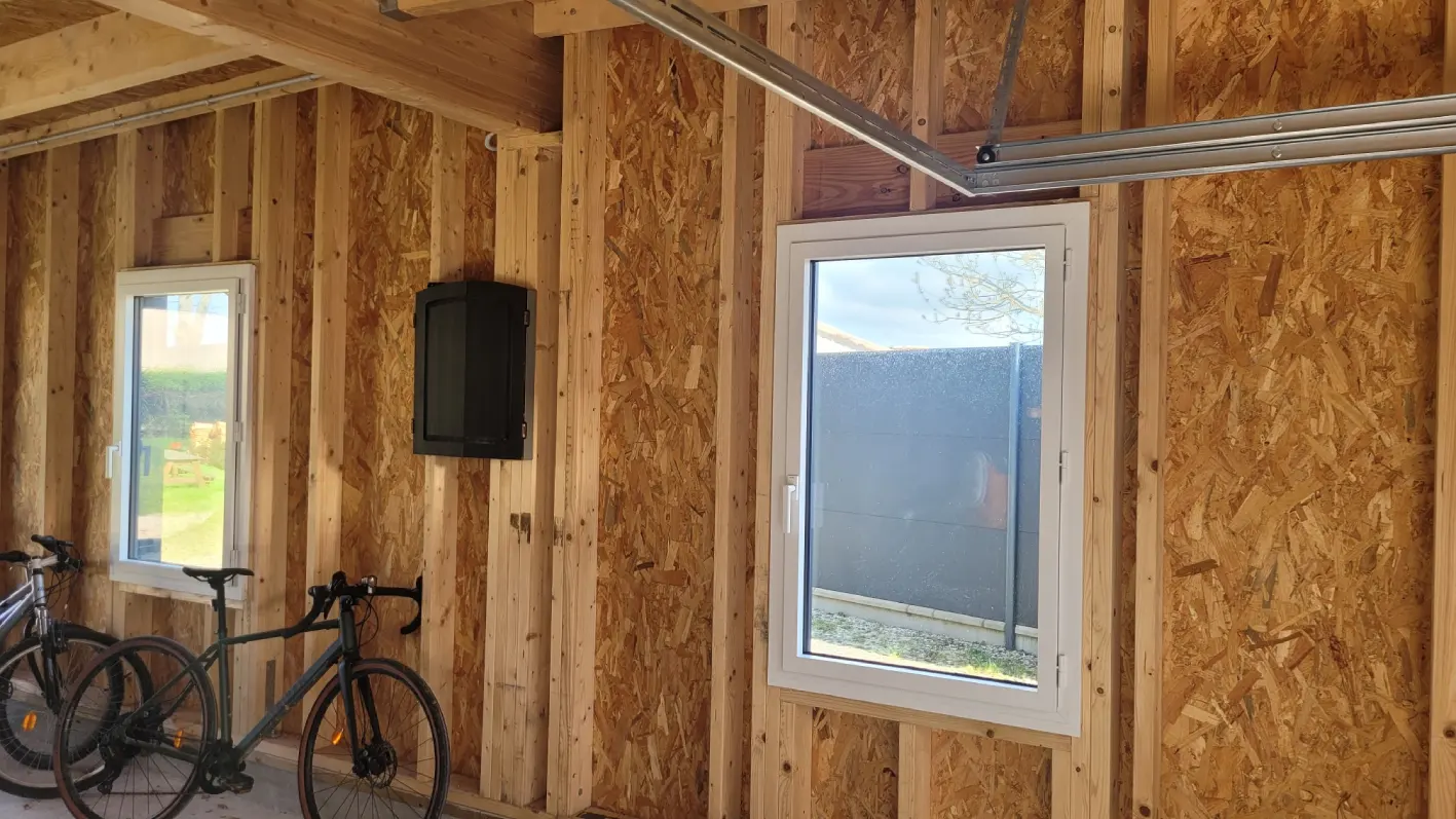 Le préau est fermé côté rue par deux portails sectionnels en métal laqué, pour plus de sécurité, et il est ouvert côté jardin.