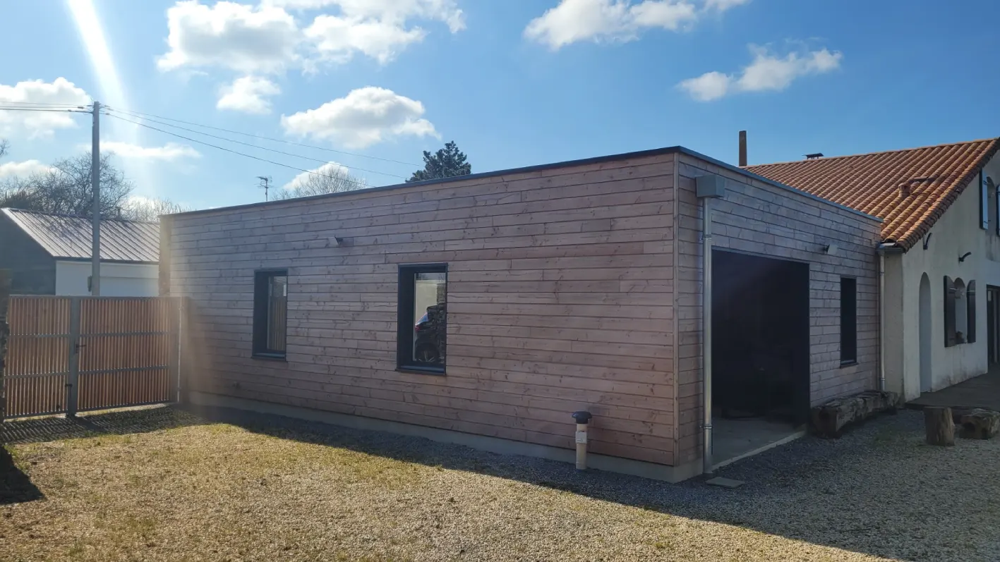 Le mur côté rue est en parpaings recouverts d’un parement en pierres pour rappeler l’ancienne dépendance. Le reste de la construction est en ossature bois avec un bardage en bois naturel (douglas). Les menuiseries sont en aluminium laqué (gris RAL 7016). La toiture terrasse est recouverte d’une membrane d’étanchéité.