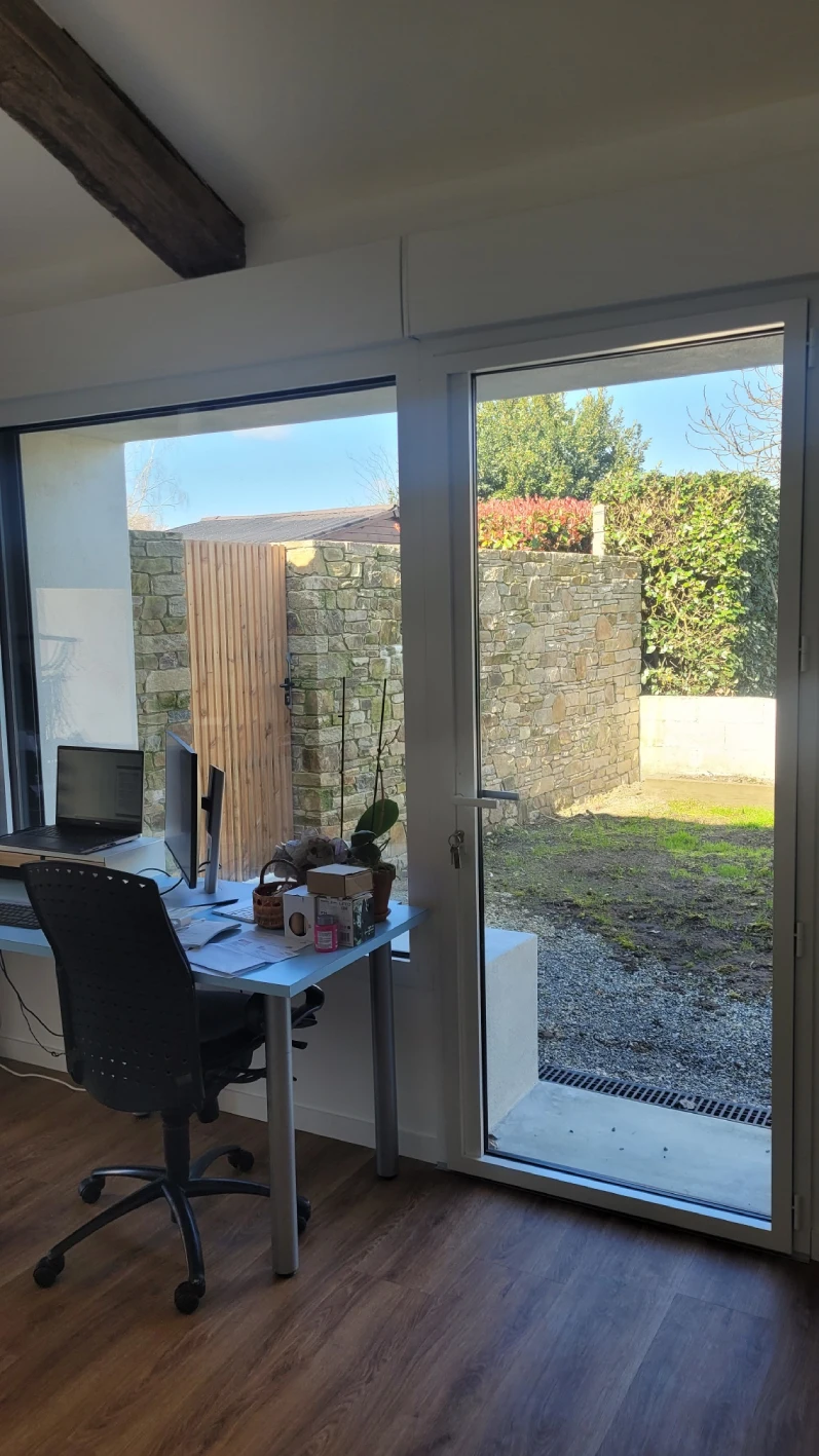 Le volume a été entièrement isolé et doublé. Une fenêtre de toit a été créée ainsi qu’une fenêtre sur le pignon pour l’atelier et un ensemble vitrée (porte+fenêtre) sur la façade arrière pour le bureau.
