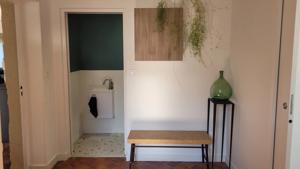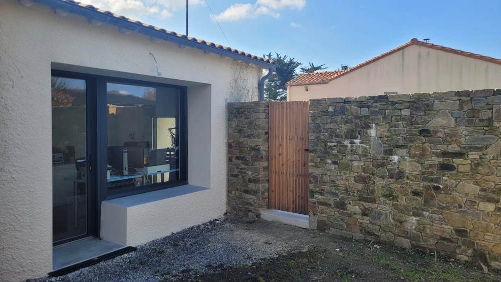Outre la rénovation de cette dépendance, il y a aussi eu le réagencement complet de la partie nuit (entrée, WC, chambre, salle d’eau, dressing chaufferie et lingerie) située au rez-de-chaussée ainsi qu’une extension en ossature bois (préau).
